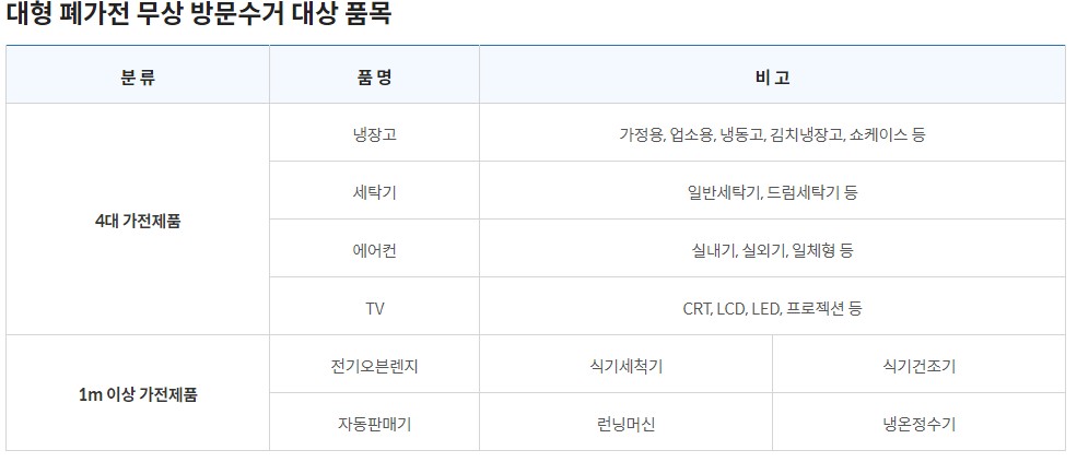 폐가전 무상방문수거 대상은 TV, 냉장고, 에어컨, 세탁기 및 높이 1미터 이상 가전제품이 해당됩니다만, 원형이 훼손되거나 파손된 제품은 수거가 되지 않습니다.