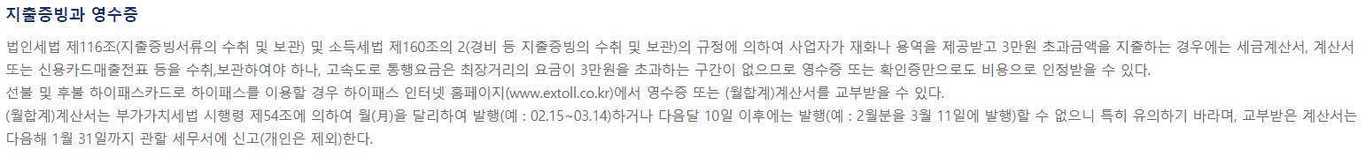 만약 계산서 수취를 하지 않았을 경우에는 신용카드영수증, 통행료 영수증 등으로 사업장 지출증빙으로 사용 가능하며, 자동충전하이패스를 사용하시는 분들 중 3만원 초과 통행료는 영수증수취명세서 - 35. 유료도로 통행료에 입력하셔야 가산세 부과를 당하지 않습니다.