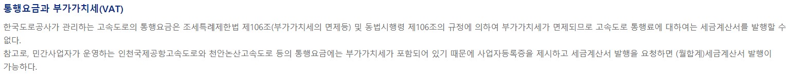 먼저 한국도로공사의 고속도로 통행료는 조세특례제한법 제106조 부가가치세의 면제 등 및 동법시행령 제106조의 규정에 의해 고속도로 요금 세금계산서 발행할 수 없으나, 인천국제공항고속도로, 천안논산고속도로 등의 민간사업자가 운영하는 고속도로 요금은 계산서 발행이 가능합니다.