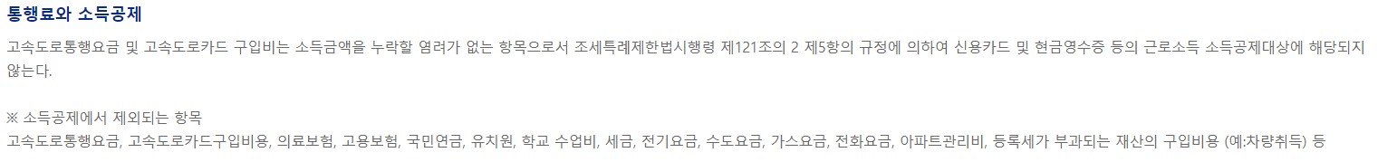 하이패스요금, 고속도로 통행료 연말정산이 되지 않는 이유는 한국도로공사 등의 고속도로를 운영하는 회사에서 고속도로 통해요금, 하이패스카드 매출액을 누락할 염려가 없다는 이유이고, 조세특례제한법시행령 제121조의 2 제5항에 의거해 신용카드 및 현금영수증 등의 근로소득 소득공제대상에 해당되지 않습니다.