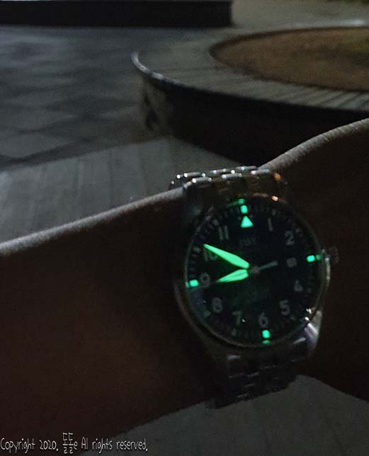 남자예물시계 iwc어린왕자 야광 모습입니다. 12시, 3시, 6시, 9시, 시침, 분침에만 야광이 적용되었으며, 그외 숫자에는 야광인덱스가 적용되지 않았으나 시계를 보는데는 딱히 불편함은 없습니다.