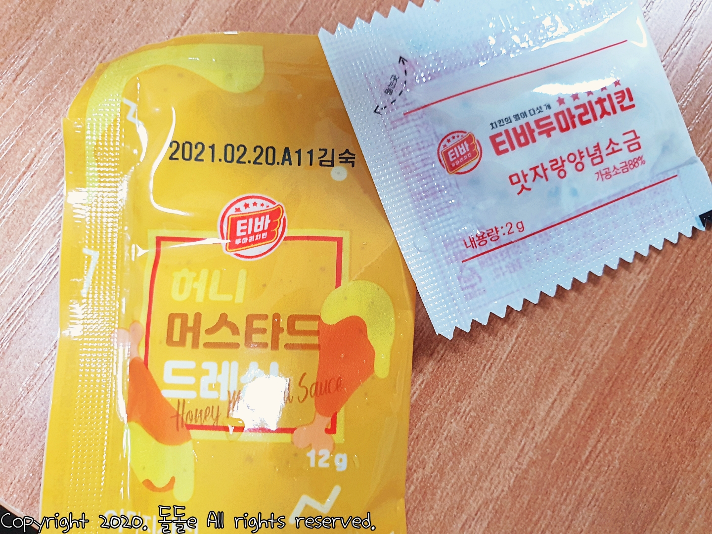 티바두마리치킨 후라이드에는 허니머스타드소스와 맛소금이 제공됩니다.