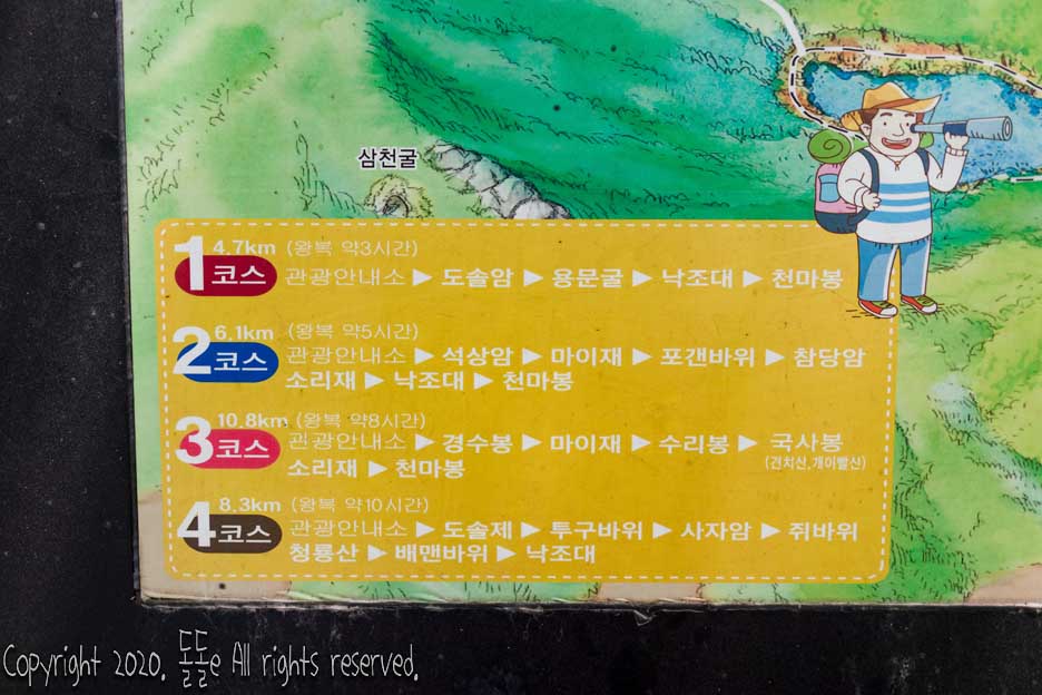 - 2코스 6.1km 관광안내소 - 석상암 - 마이재 - 포갠바위 - 참당암 소리재 - 낙조대 - 천마봉 왕복 5시간 코스