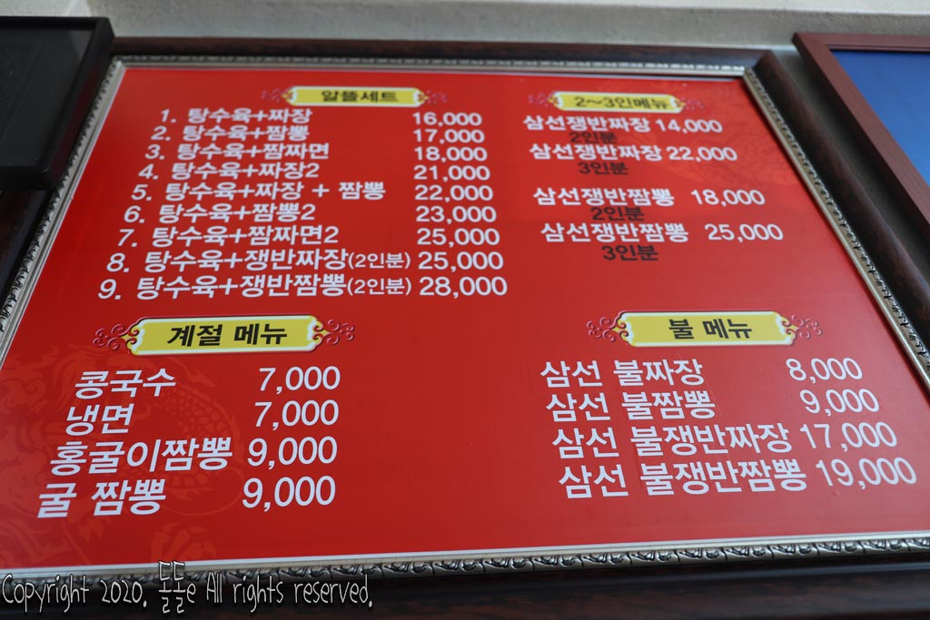 고창맛집 나래궁 인기메뉴 짬짜면 가격은 7천원, 차돌박이짬뽕 9천원, 홍합짬뽕 7천원, 삼선불짬뽕 9천원으로 판매되고 있다.