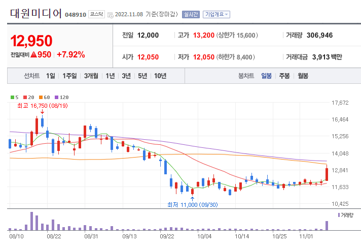그 외 네이버 웹툰 관련주 naver, 디앤씨미디어, 카카오, 미스터블루, NHN 있으며, 11월 8일 네이버웹툰 대장주 엔비티 입니다.