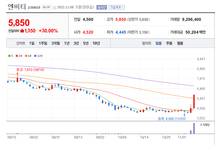 11월 7일 네이버가 네이버웹툰의 미국 상장을 언급하며, 네이버 웹툰 관련 종목들이 급등을 했고, 엔비티는 상한가 마감했습니다.