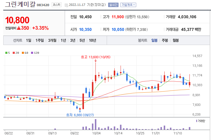 그린케미칼 시총은 2592억원이며 11월 17일 기준 거래대금은 453억원 입니다. 그린케미칼은 2022년 7월 20일 시가배당율 1.1% 주당 80원의 중간배당 결정할 정도로 주주친화적인 기업입니다.
