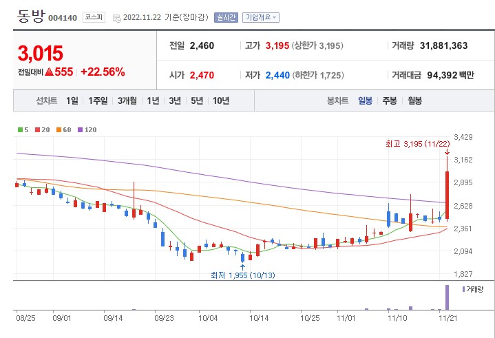 또한 화물연대파업관련주 동방은 전자상거래업체 쿠팡의 물류를 전담하는 것으로 알려졌으며, 물류 대란으로 동방에 대한 수혜가 기대되며 매수세가 몰리면서 물류파업 대장주 역할을 했습니다