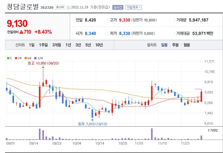 화장품관련주식 청담글로벌주가는 +8.43% 상승한 9130원에 거래를 마쳤습니다.