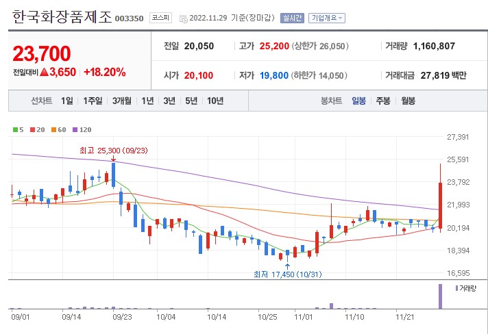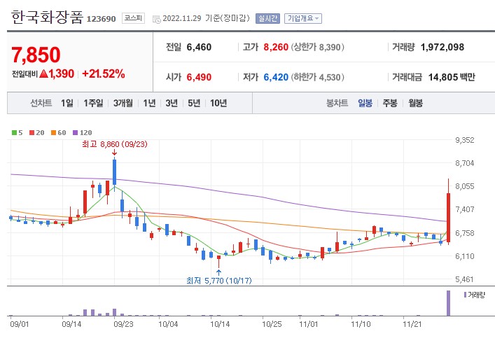 한국화장품 주가는 11월 29일 21.52% 상승한 7850원에 장 마감했습니다.