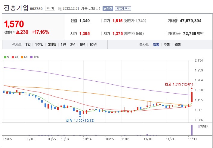건설관련주 진흥기업 주가는 17.16% 상승한 1570원으로 거래를 마쳤습니다.