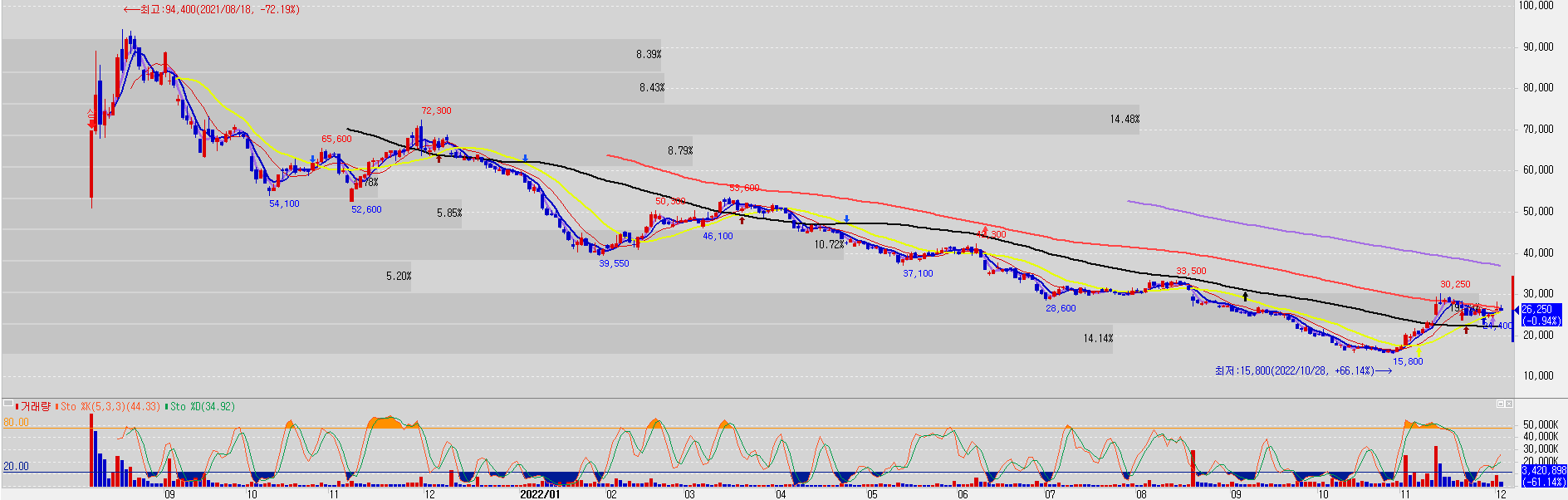 재밌는게 최고가 대비 주가 -72.19%인데 2022년 10월 28일 카카오뱅크 최저가 15800원 대비 현재 주가 26250원은 +66.14% 상승한 상황입니다.